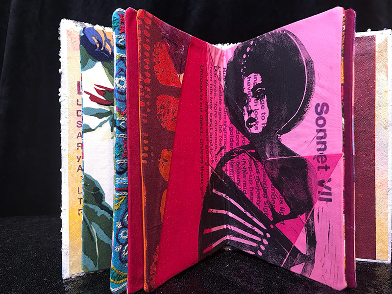 The carefully screen printed sonnets gain additional layers of meaning on the book pages. The text is complemented by my linocut prints and screen prints. The pages move from one voice to many, offering multiple readings to a wide range of audiences.