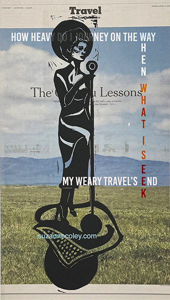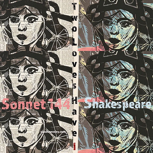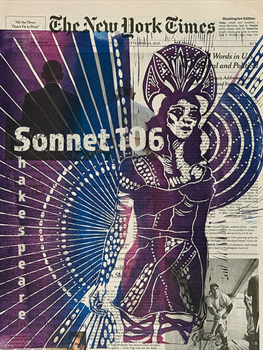 Linocuts prints on newspaper. This series juxtaposes the enduring voice of Shakespeare's 17th century sonnets with the transience of daily news. Printed on current newspapers, my linocuts illuminate tensions between permanence and impermanence, history and immediacy, situating Shakespeare's verse in dialogue with the present.