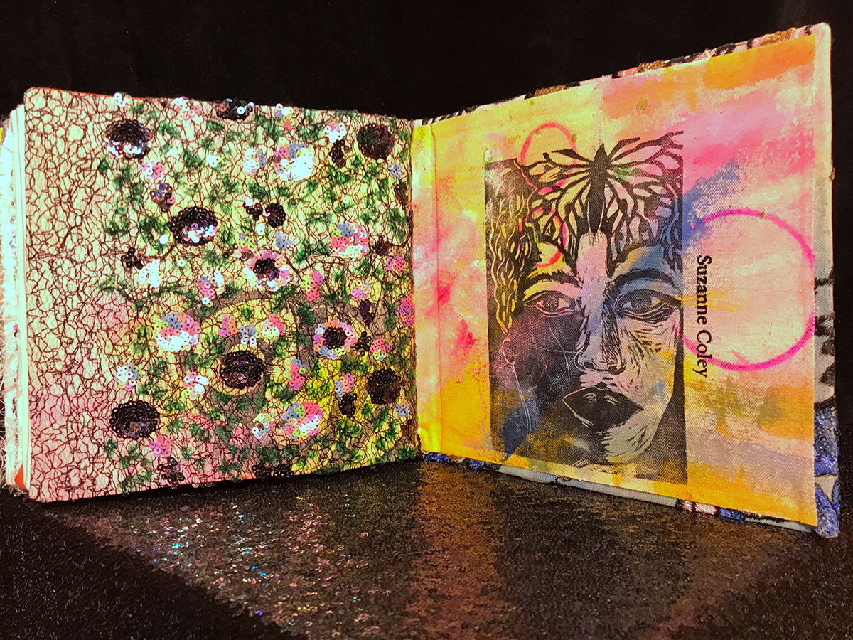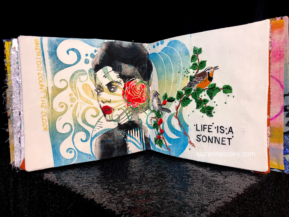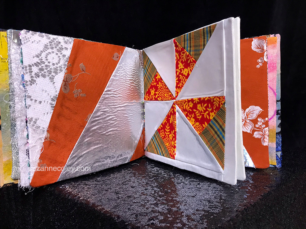Hand crafted textile book created with repurposed clothing and a wedding dress.