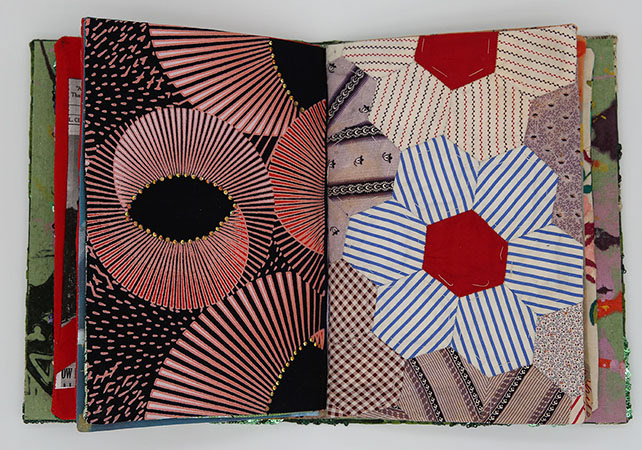 But once opened, the interior of my books tell a different story. The pages are quilted, stitched from scraps, printed with linocuts and silkscreens on fabric, recalling the resourceful traditions of African American sharecropper quilting.
