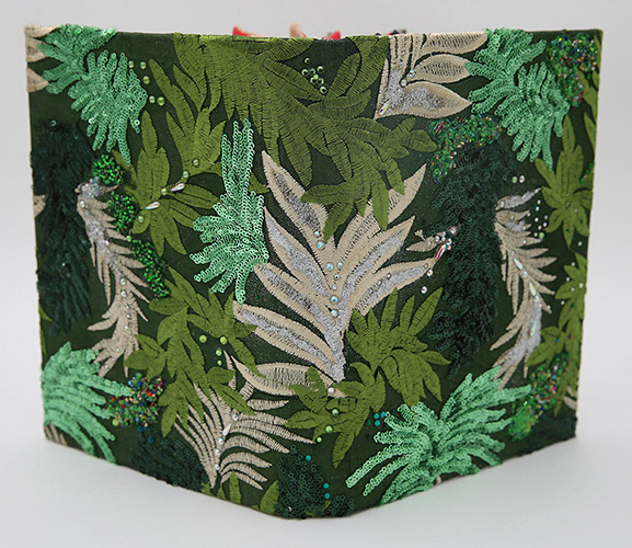 On its surface, the embroidered cover invokes the aristocratic traditions of 16th through 18th century Europe, where noblewomen labored over needlework skills and expensive metallic threads to bind devotional texts and poetry. These bindings were markers of wealth, refinement, and permanence. They were objects made to admire as much as read.