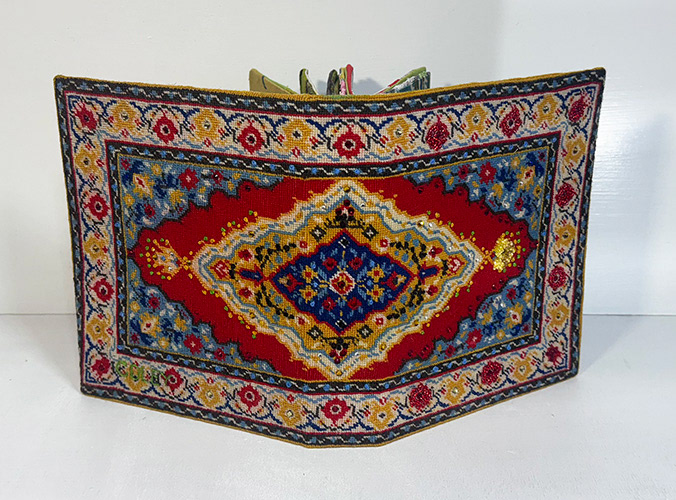 “The patterned geometry of a Turkish rug became the visual motif. By translating its intricate design on the book’s cover, I transformed a textile usually left underfoot into an object of contemplation, echoing the sonnet itself. Stitched on a 20-count Penelope canvas using the continental stitch, each deliberate motion became a parallel to Shakespeare’s craft: beauty shaped through patient accumulation. Each stitch a line of verse, each row a wave of time.